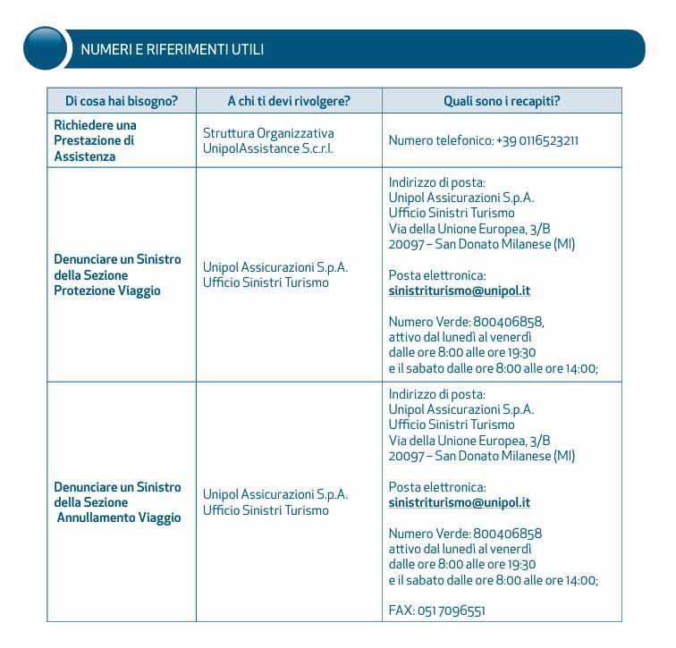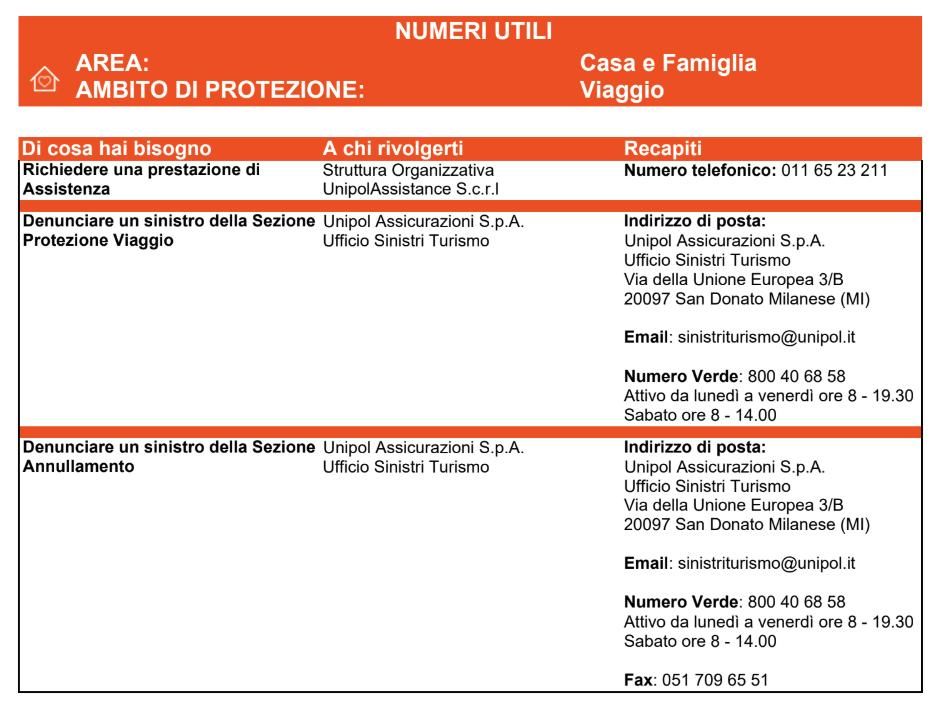 Numeri utili PER POLIZZE VIAGGI